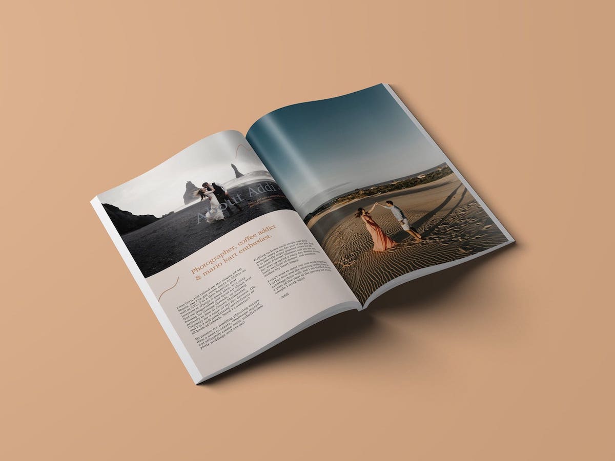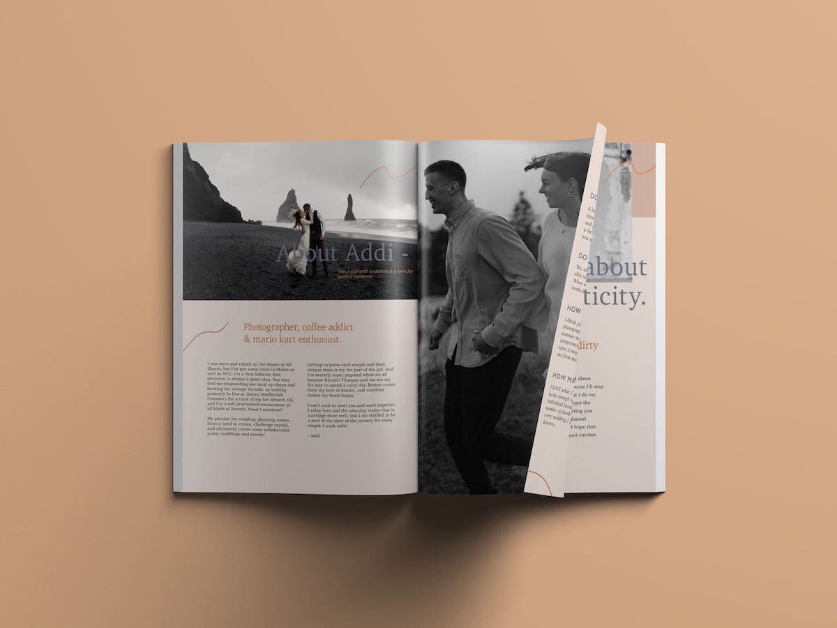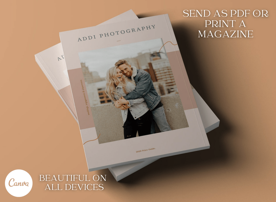 This wedding photographer guidebook is a pre written, drag and drop Canva template. It's SUPER simple to edit. Simply add your own images, customize the text, and you've got your own beautiful photography price list magazine & info guide.