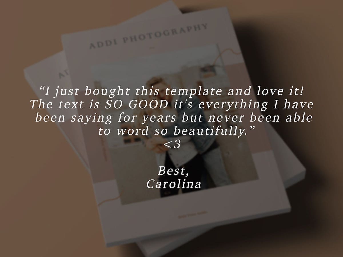 Simply drag your images into the image boxes, tweak the PRE WRITTEN text to your liking, and export as a beautiful custom pdf for your photography studio in MINUTES.