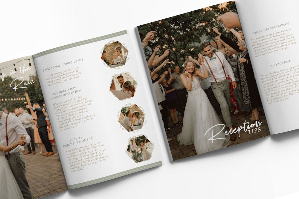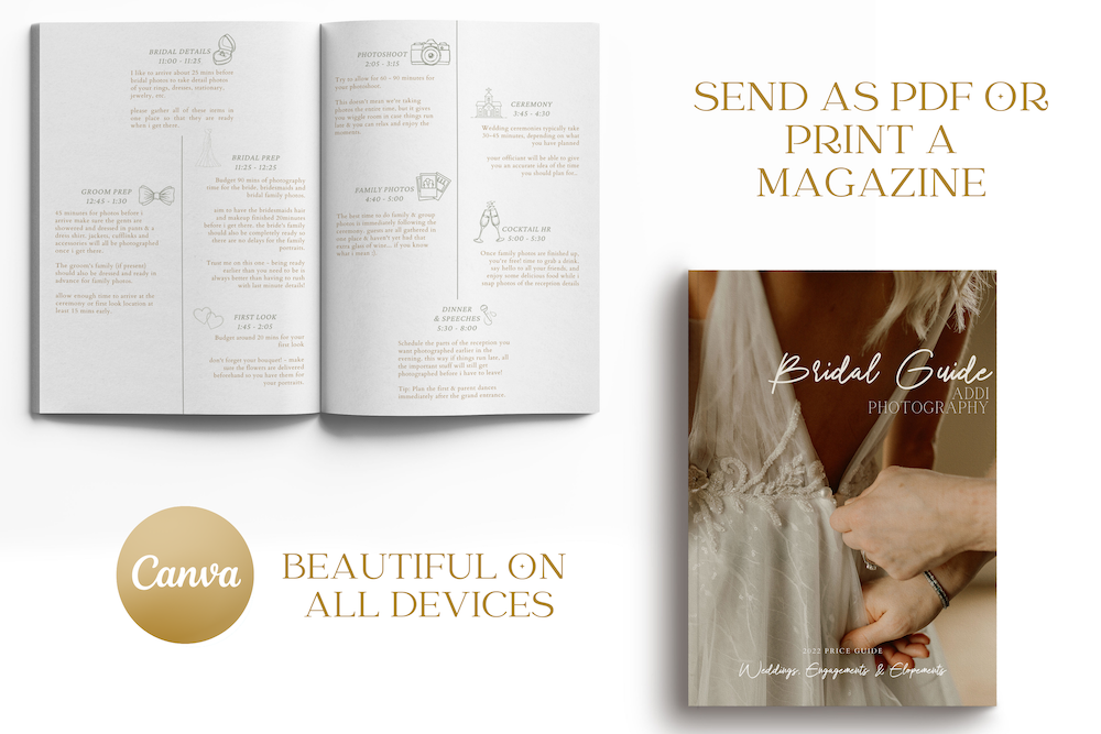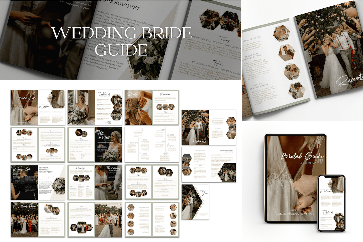 BRIDE GUIDE BOOK - The perfect info guide for your bride to have a WOW experience and get everything ready in advance for the perfect day & incredible photos. Wedding timeline examples, details and suggestions for every step of the day & planning so that the photos are as seamless & jawdropping as possible. This guide will truly change your photography experience with weddings FOREVER - It's THAT helpful!