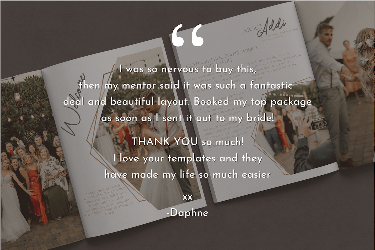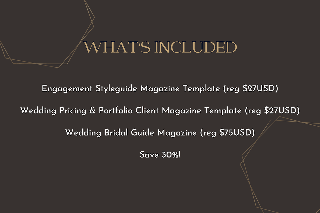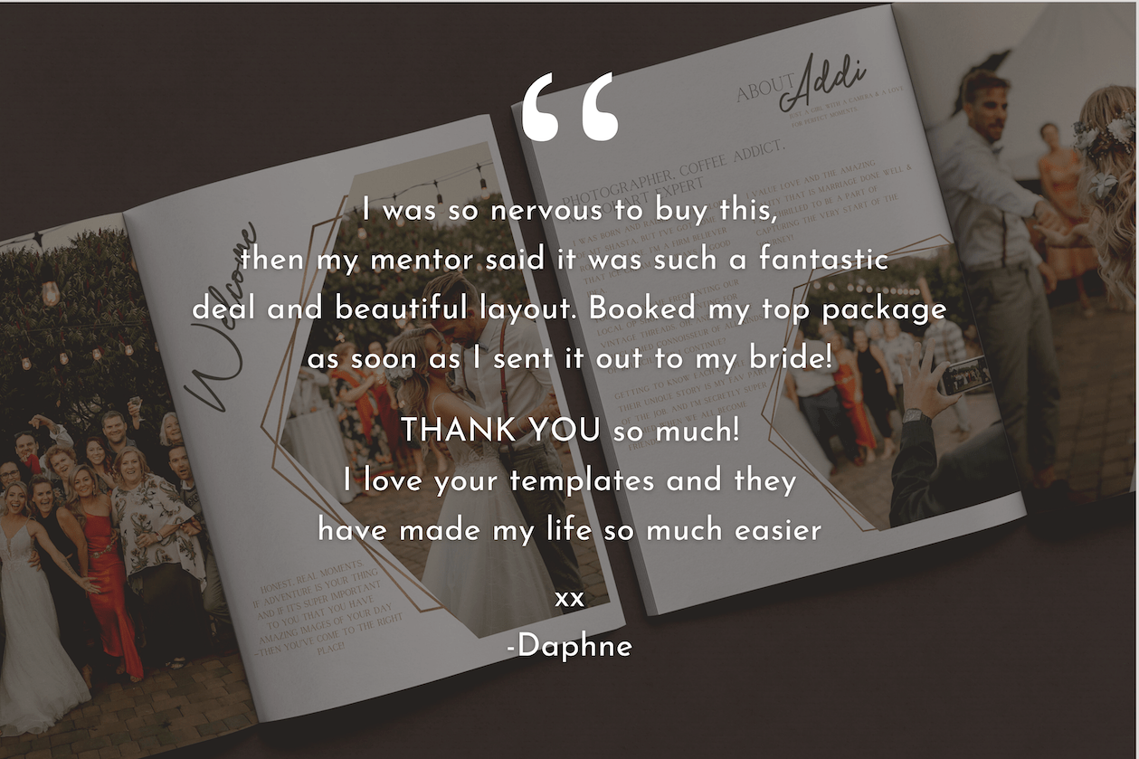 Having this total branding package for your wedding business will separate you from other photographers and give your clients a WOW experience that builds your reviews & expands your referrals. For $90USD to potentially generate tens of thousands in extra revenue for your business, it's a no brainer.