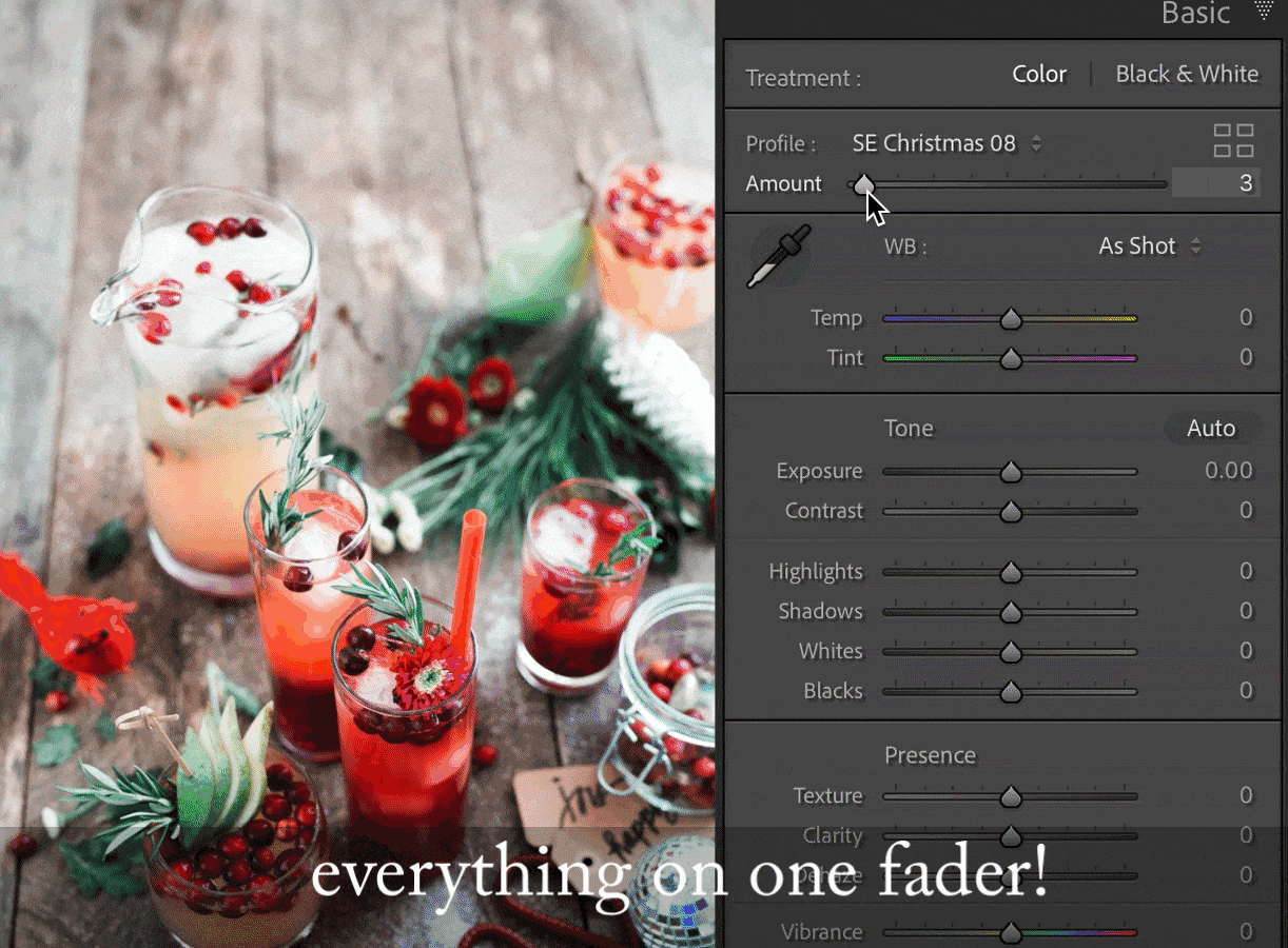 The Christmas Lightroom Presets were engineered using custom color profiles. This lets you control the entire preset with just ONE fader. Blend in the intensity of the preset just like you would on instagram or VSCO.
