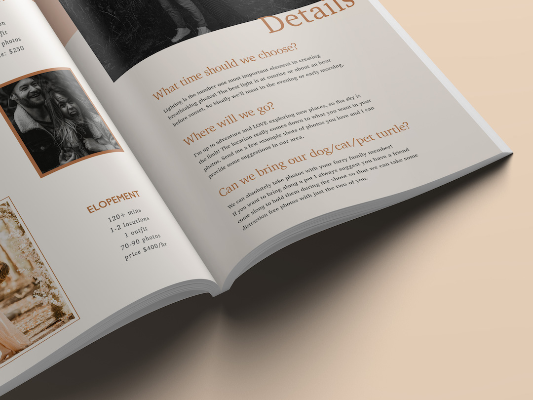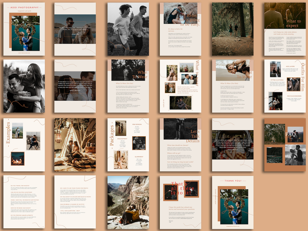 This style guide includes all the welcome info you need to impress your clients and prepare them in for an amazing engagement or couples photography session. Inside you'll find a guidebook for outfits, client info, what to wear, what to expect, style tips, extra photography package guide and much more.