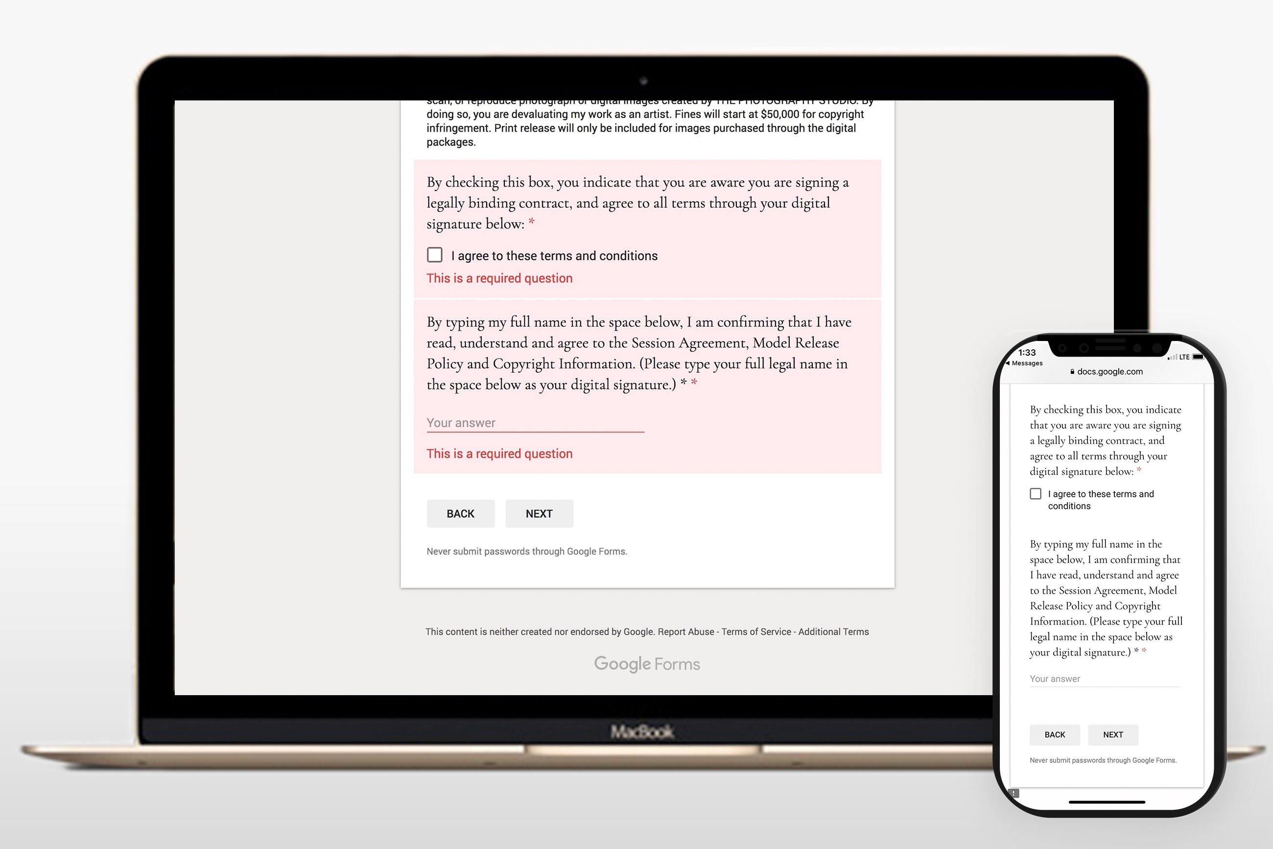 PART 6 - SESSION CONTRACT AGREEMENT <--- Clients can digitally sign your contract agreement right on the form. Add a link to your payment info and they can complete the whole booking process without you doing a thing!