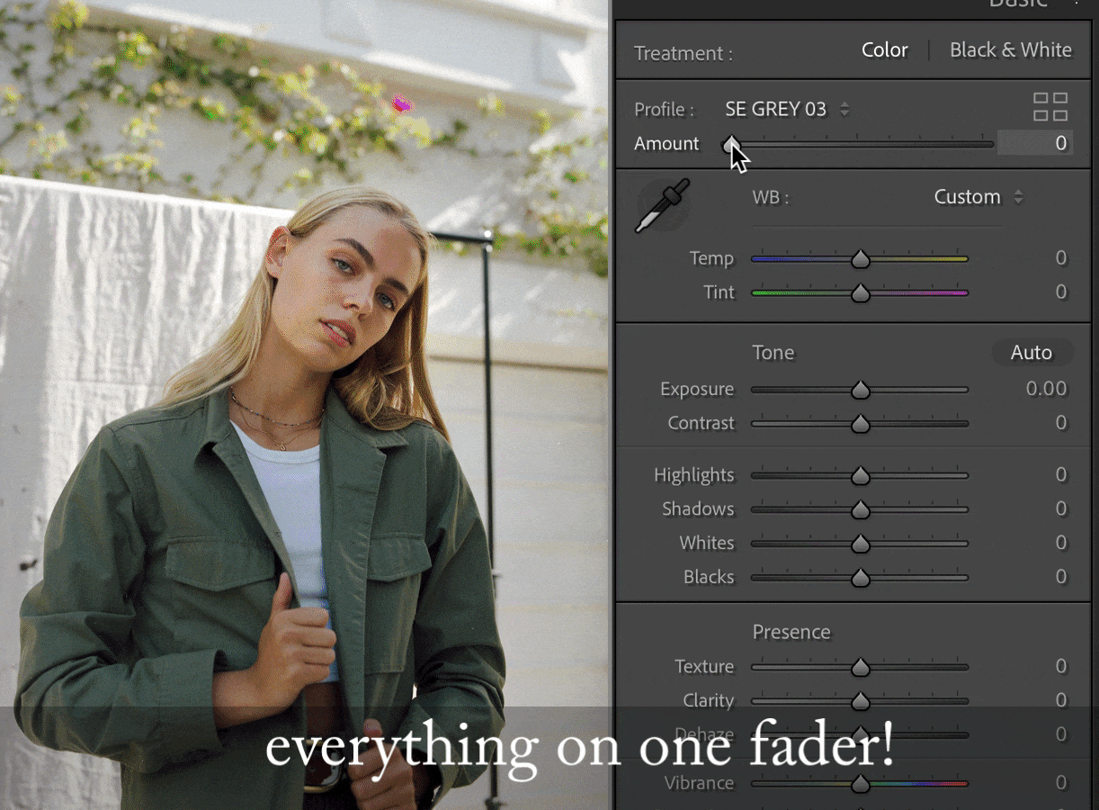 The Grey Preset Collection presets were engineered using custom color profiles. This lets you control the entire preset with just ONE fader. Blend in the intensity of the preset just like you would on instagram or VSCO.