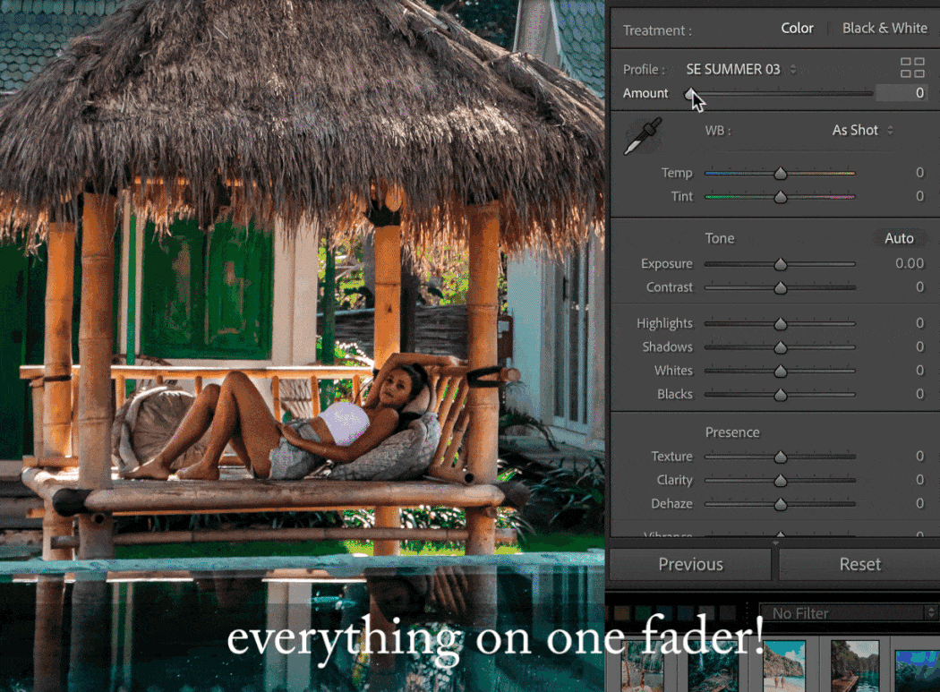 The Summer Lightroom Preset Collection was engineered using custom color profiles. This lets you control the entire preset with just ONE fader. Blend in the intensity of the preset just like you would on instagram or VSCO.