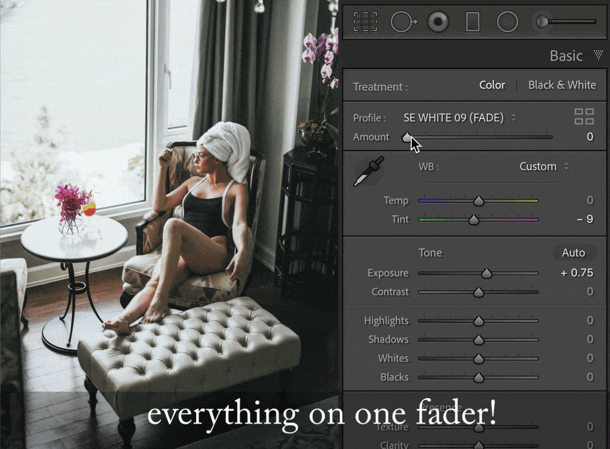 The White Collection presets were engineered using custom color profiles. This lets you control the entire preset with just ONE fader. Blend in the intensity of the preset just like you would on instagram or VSCO.